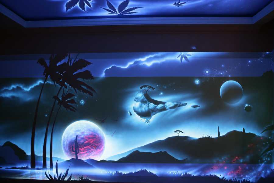 - широкий спектр применения. На данный момент рынок ЛКМ предлагает огромный выбор светящихся красок. Их можно подобрать буквально для всего: для стен, потолков, фасадов дома, наружной рекламы. Существуют краски для творчества, тканей, волос, ногтей, кожи, и т.д. Такой огромный выбор обуславливает большую популярность флуоресцентных красок. Примеры дизайна интерьера при помощи флуоресцентных красок представлены ниже: