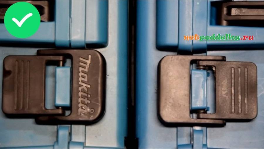 - Люфт. Настоящий чемодан от Makita не имеет люфта. Детали держатся прочно. Копии дребезжат, ходят в стороны. Люфты оригинала выполнены очень качественно, без грязи. Подделка же не может похвастаться этим.