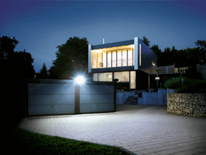 Среди мощных прожекторов, оснащенных сенсором движения, этот выделяется повышенной яркостью. Прибор излучает световой поток 4000 лм. Благодаря такой характеристике фонарь подходит для освещения просторной территории рядом с коттеджем или для охраны промышленных объектов.