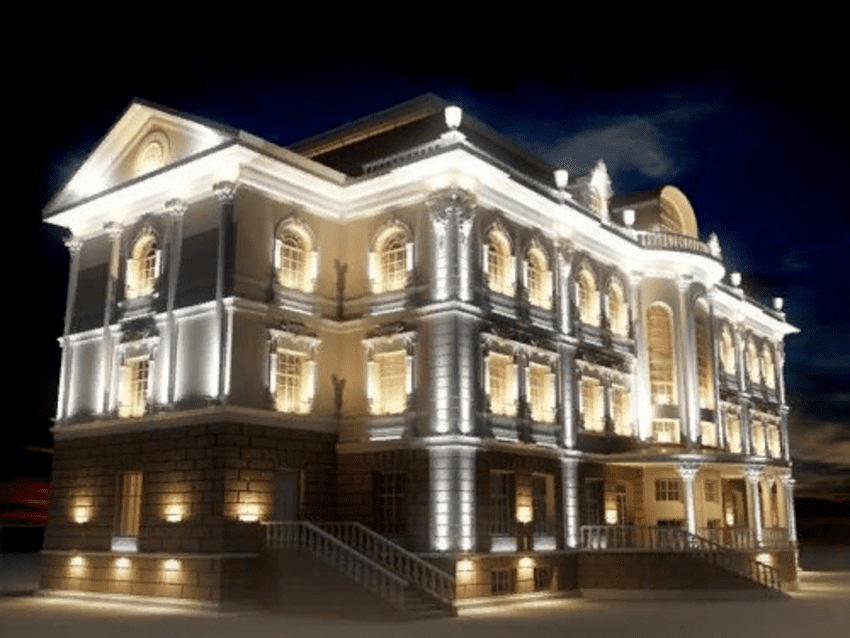 В отличие от ландшафтных приборов архитектурные устанавливаются на возвышении. Используются они для подсветки архитектурных элементов здания, всего сооружения или памятника. Свет подается рассеивающий или направленный, часто в разном цвете под острым углом для подчеркивания рельефа освещаемой поверхности.