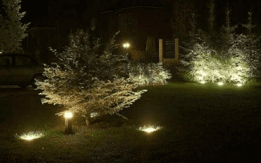 Приборы устанавливаются на грунте возле насаждений, памятников, рекламных конструкций. Это могут быть и природные водоемы, водопады, горы. Таким образом организуется декоративная подсветка наземных объектов на территории частного дома, парка, игровой площадки или зоны отдыха.