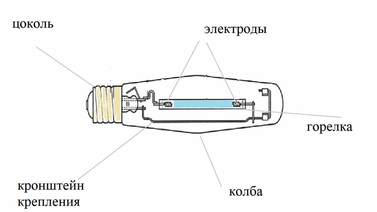 - Горелки – как правило, трубка из оксида металла, внутри которой и происходит электрический разряд. Наполняется смесью инертных газов и паров металла, в зависимости от модели, наполняемые компоненты могут существенно отличаться.