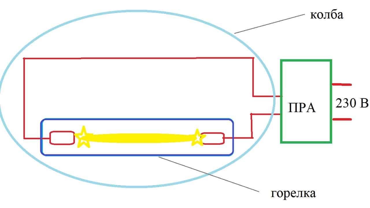 Заметьте, несмотря на то, что в конструкции самой газоразрядной лампы ПРА отсутствует, без него запустить устройство не получится. В состав пускорегулирующего аппарата входит: