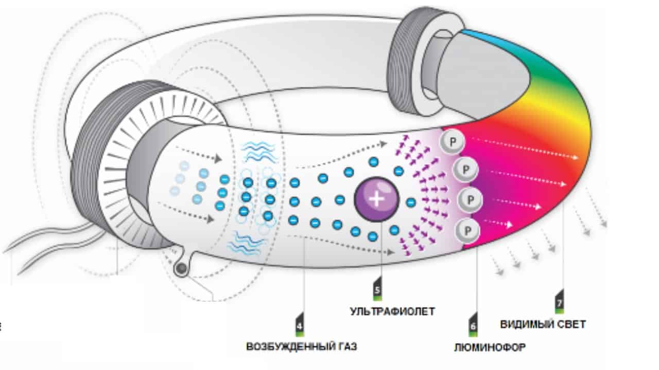 Люминофор поглощает выделяемые парами ртути ультрафиолетовые волны, выделяя при этом излучение видимого светового спектра.