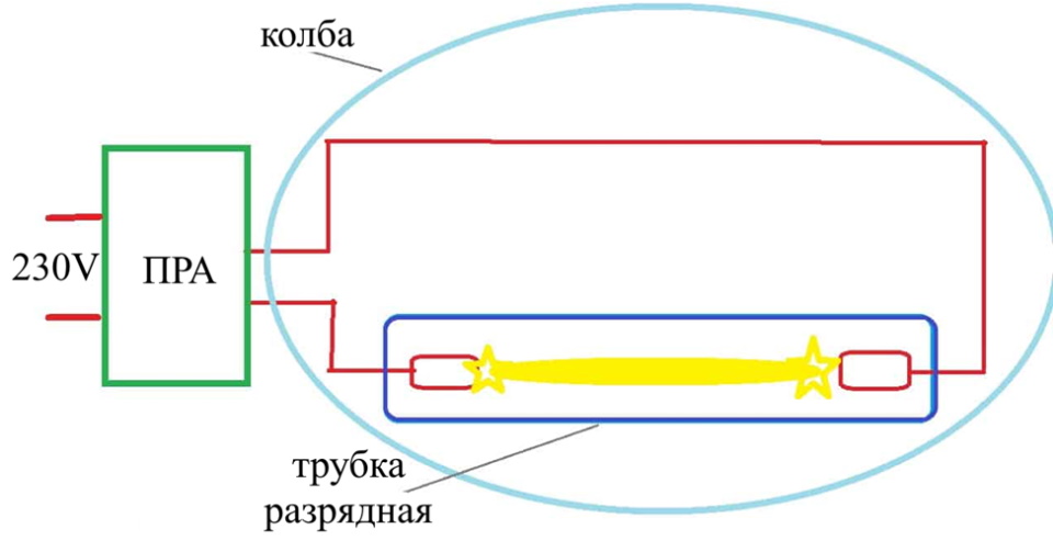 Напряжение, поступающее в светильник, преобразуется в пускорегулирующем аппарате (ПРА) и для подачи на электроды повышается до 2-5 кV. Таких величин достаточно, чтобы вызвать искру для зажжения тлеющего разряда внутри трубки.