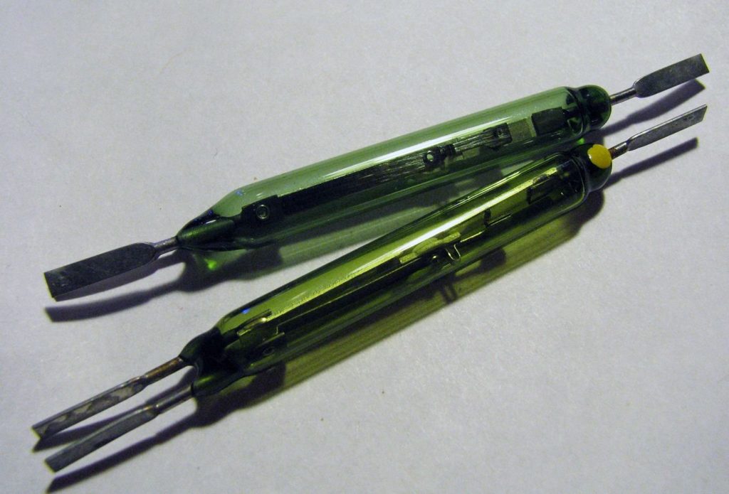 Простейший магнитоуправляемый контакт (МУК) представляет собой стеклянную трубочку (колбочку) с впаянными в нее пермаллоевыми пластинками – контактами, между которыми оставлен рабочий зазор. Колбочка заполнена азотом или другим инертным газом для предотвращения электрокоррозии. Под воздействием внешнего магнитного поля между пластинками возникает тяговое усилие и они смыкаются. Соприкасающиеся поверхности контактов покрыты серебром, золотом, родием.