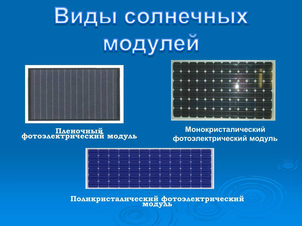 Все выпускаемые сегодня солнечные модули можно условно разделить на несколько основных типов. Все они имеют разные КПД, обладают собственными преимуществами и недостатками.