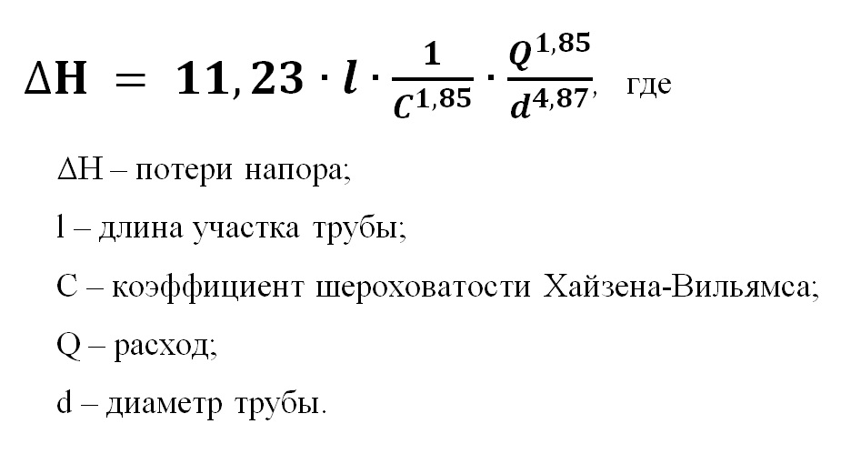 Потери давления по причине трения для воды рассчитывают по формуле Хазена — Вильямса: