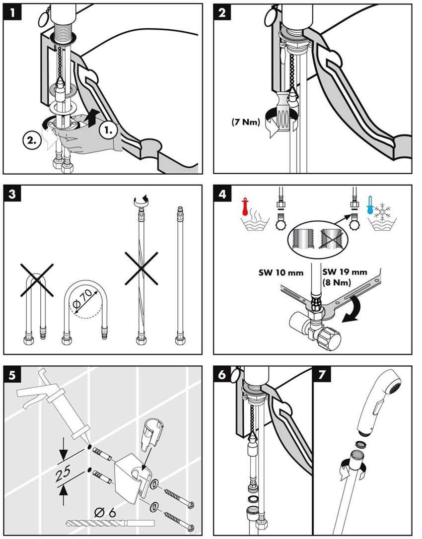 | Кран устанавливают в раковину. К нижним штуцерам подключают подводку горячей и холодной воды, шланг гигиенического душа в стальной спиральной оболочке. Открывают вентили магистральных кранов, убеждаются в отсутствии течей. | |