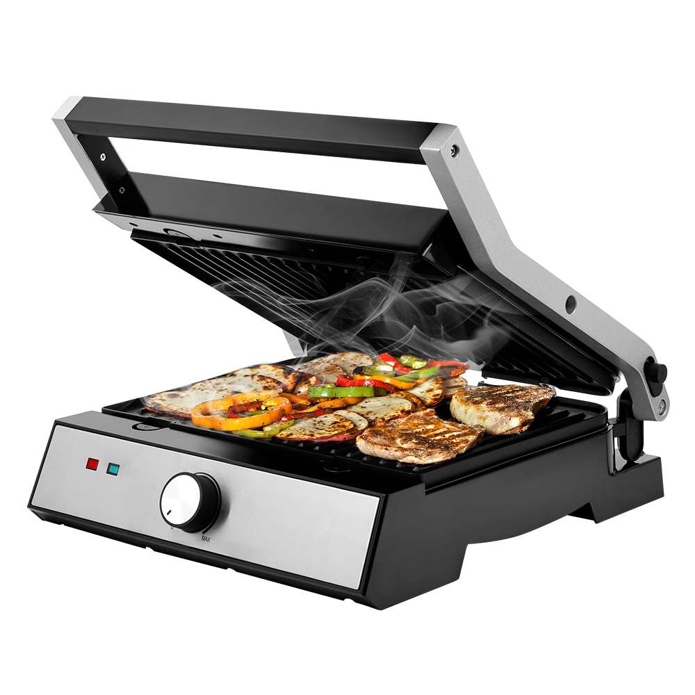 Ещё один представитель рейтинга лучших недорогих электрогрилей. Прибор мощностью 2 кВт запечет мясо, птицу, овощи и грибы, приготовит сложные горячие бутерброды с сыром. Нагреваются и основание, и крышка, поэтому прибор можно использовать как в закрытом положении (гриль), так и в открытом (барбекю), откинув верхнюю пластину на 180° и в 2 раза увеличив площадь для жарки. При этом, естественно, увеличивается и время приготовления, зато удобно контролировать процесс: визуально или, например, специальным кухонным термометром. Если готовить в закрытом положении, чтобы разместить объемный продукт, например, половину цыпленка, крышку можно зафиксировать на необходимой высоте.