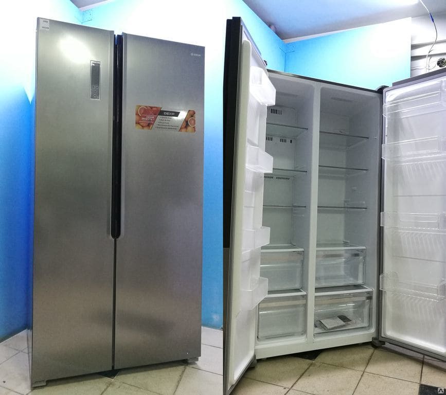 Этот вид бытовой техники отличается тем, что имеет увеличенную ширину и две распашные створки, которые установлены на боковых петлях. Такая конструкция корпуса холодильника позволила увеличить полезный объем морозильной камеры.