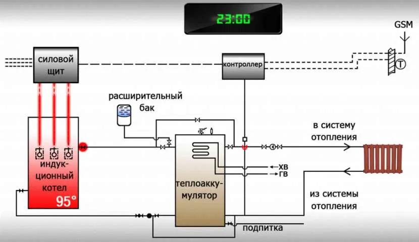 Система с индукционным котлом оснащается циркуляционным насосом, расширительным баком, запорно-регулируемой аппаратурой (шаровые краны и тому подобное). В частных домах, как правило, используется типовая схема подключения.