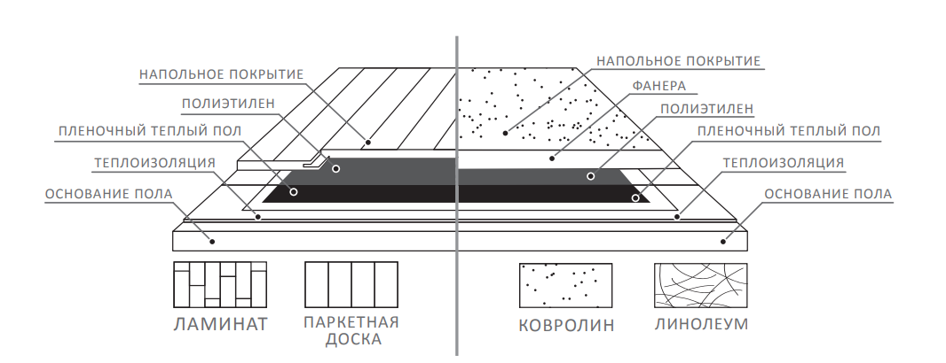 Сплошной карбоновый пленочный теплый пол можно уложить под любое напольное покрытие. Исключение составляют: