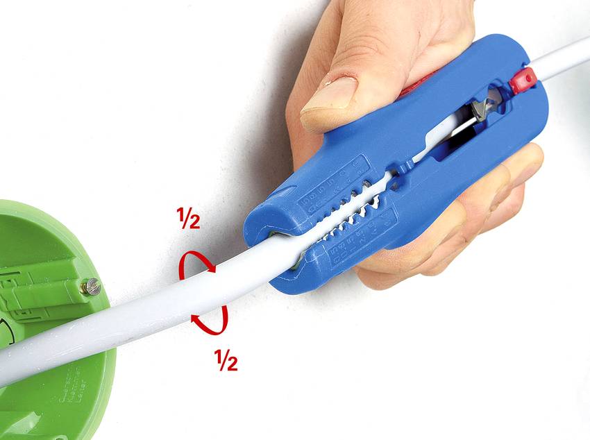 Достаточно подобрать ячейку под диаметр провода, настроить длину очистки от изоляции и прикусить кабель. Стриппер подрежет оболочку и сдернет ее без повреждения проводника