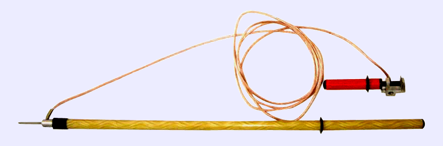 Штанга наложения заземлений. Также применяются на электрических установках с напряжением до 220 кВ с постоянным или переменным током. Это приспособление позволяет работать на участках с остаточным напряжением или частичным отключением установки.