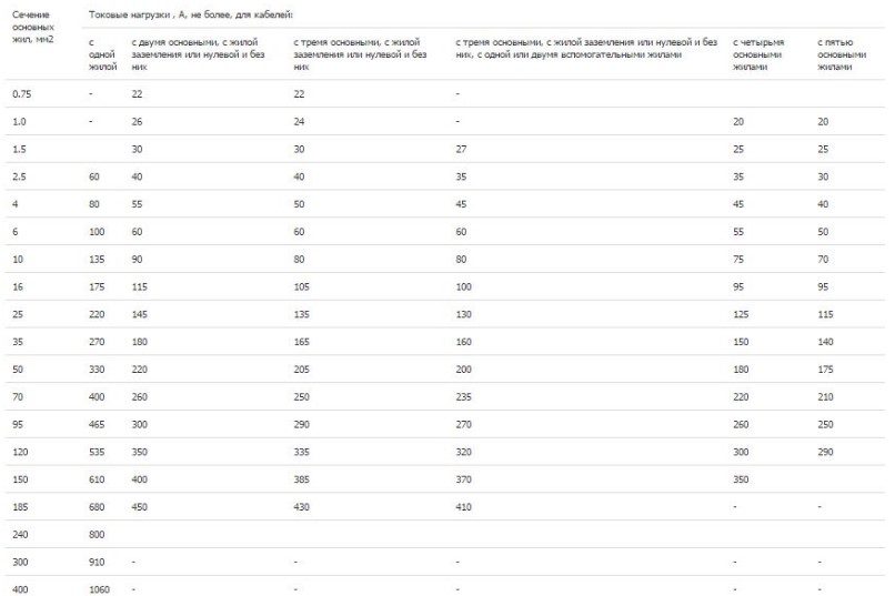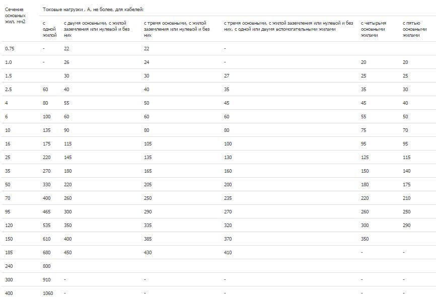 | Площадь сечения, мм² силовых жил | Ток (А) для двухжильных кабелей | Ток (А) для трехжильных кабелей + земля, «0» | Мощность (кВт) при напряжении 220 В | Мощность (кВт) при напряжении 380 В |