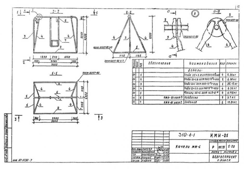 Составляя чертежи такой конструкции, следует исходить из того, что ширина посадочного места для одного человека должна быть не менее 0,5 м. Высота лавочки над землей выбирается такой, чтобы было удобно отталкиваться ногами при качании. Она может качнуться вбок, поэтому чтобы избежать столкновения скамейки с опорами расстояние между ними для веревки выбирается не менее 0,35 м, для цепей — 0,25 м. Высота стоек над землей выбирается 1,7 — 2,5 м в зависимости от способа качания — сидя или стоя. Для лавочки делается отдельный чертеж с указанием размеров и угла наклона спинки.