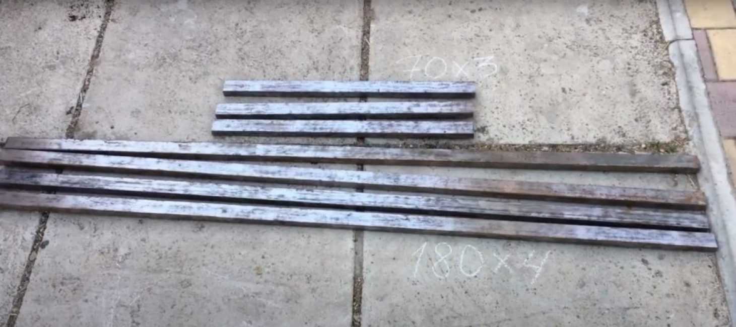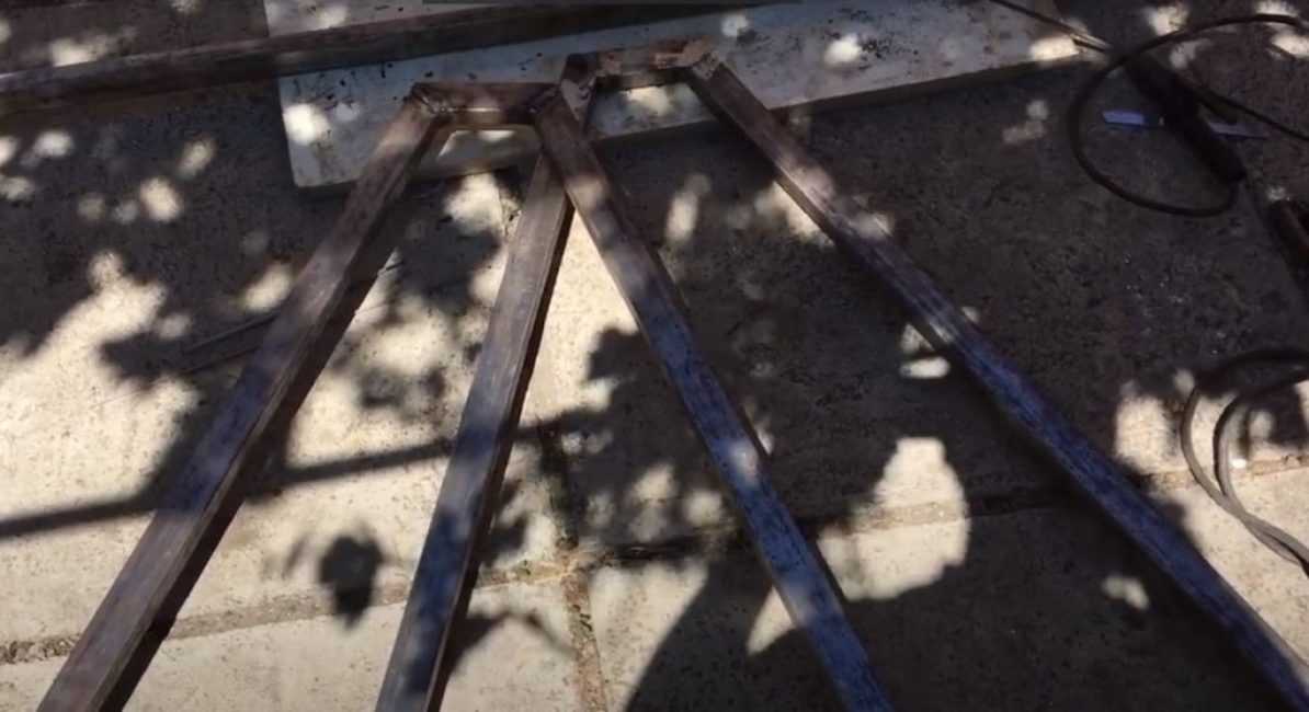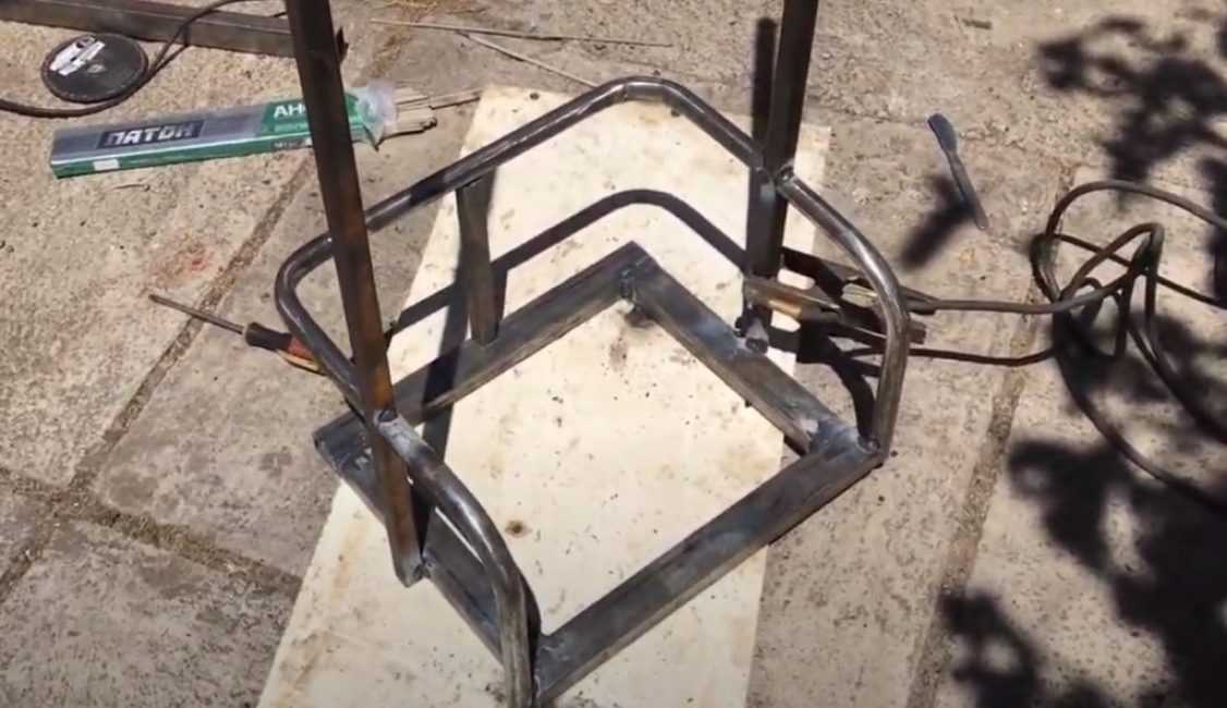 изготовление опорных конструкций (боковых). Используется труба большего сечения. С помощью заранее подготовленного шаблона намечаются контуры угловых элементов, отрезаются болгаркой. После этого опоры соединяются на сварку, в нижней части прикрепляются поперечины (распорки);