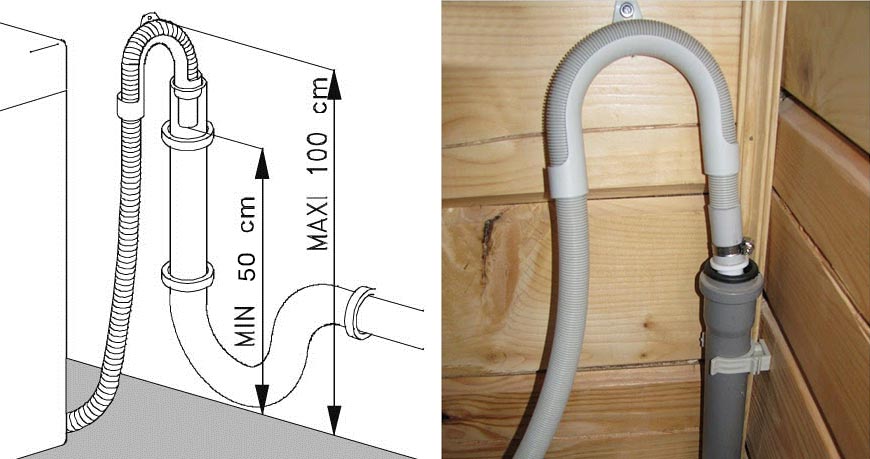 Он должен возвышаться над полом минимум на 50 см, быть в форме U. Такое положение обеспечит затвор, который заблокирует проход зловония в машинку.