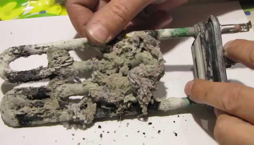Давайте также разберёмся, почему появляется накипь. Любая вода, какой бы чистой она ни казалась, содержит различные примеси: песок, глину, соли магния и кальция. Нагреваясь, соль расщепляется, образуется углекислый газ и твердый осадок. Вот этот осадок в совокупности с различными частичками грязи и «прилипает» на ТЭН и бак.