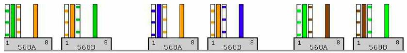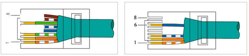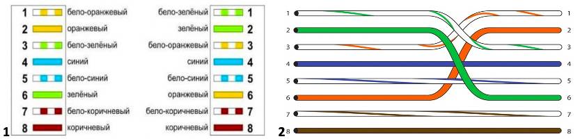 Перекрестная разводка также выполняется по вариантам А и Б. На рисунке 1 показан порядок обжима жил в высокоскоростных сетях. Слева схема B, где сигнал идет в обоих направлениях по всем 8 жилам. Тип A отображается справа, где бело-оранжевый и оранжевый провода поменялись местами с бело-зелеными и зелеными проводами.