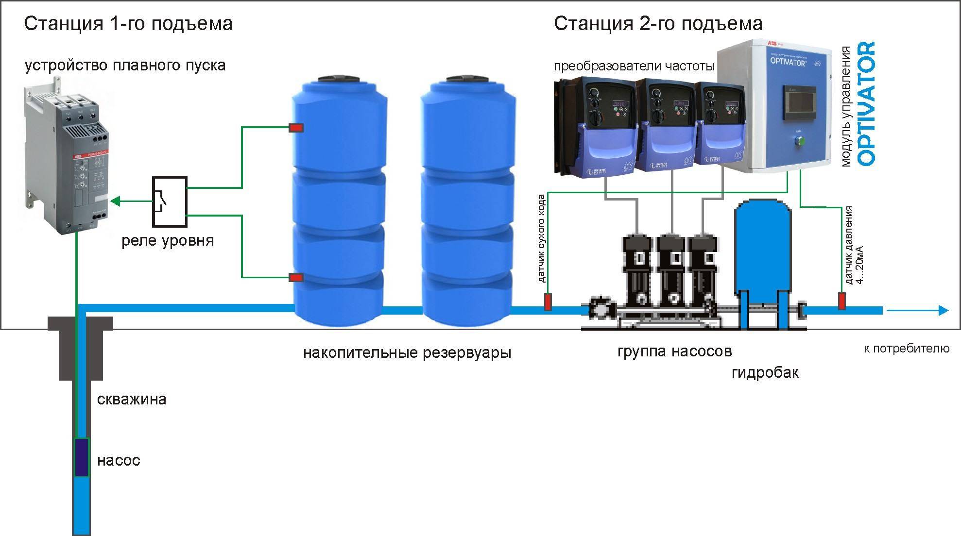 Для того чтобы насос не включался всякий раз, когда открывается кран у конечного потребителя, необходимо в системе сразу после него установить емкость для накопления воды. В идеале это должны быть баки из металла объемом 500-5000 литров. Их можно установить как на высоте, так и внизу. Если накопительный бак стоит низко (что чаще всего происходит), устанавливают также специальную насосную станцию для подачи воды потребителю.