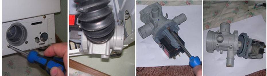 3 способ. Если два предыдущих способа оказались бессильны, то нужно полностью снимать сливной насос. Задача — прочистить улитку и достать фильтр. Способ этот довольно сложный – необходимо добраться до насоса, отцепить от улитки помпу и через получившееся отверстие добраться до фильтра.