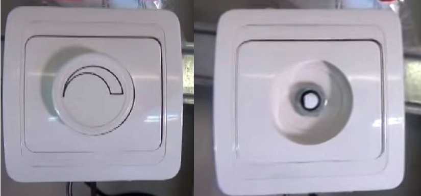 Рассмотрим как подключить диммер с поворотным диском. Сначала надо его разобрать. Для этого вынимаем диск — его надо потянуть на себя. Под диском находится кнопка, которая фиксируется прижимной гайкой.
