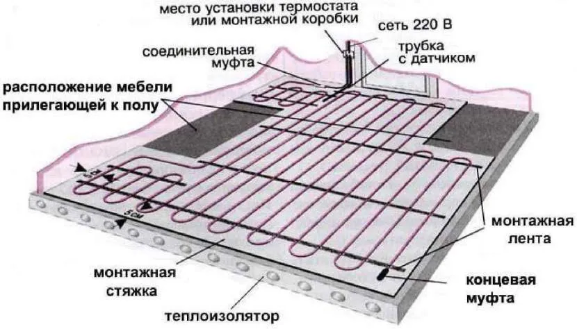 Важно учитывать и тот момент, что при расстановке мебели вы можете блокировать доступ к прибору крупногабаритным диваном, шкафом или другим предметом интерьера. Это недопустимо. Температурный датчик располагают в стяжке внутри гофрированной трубы