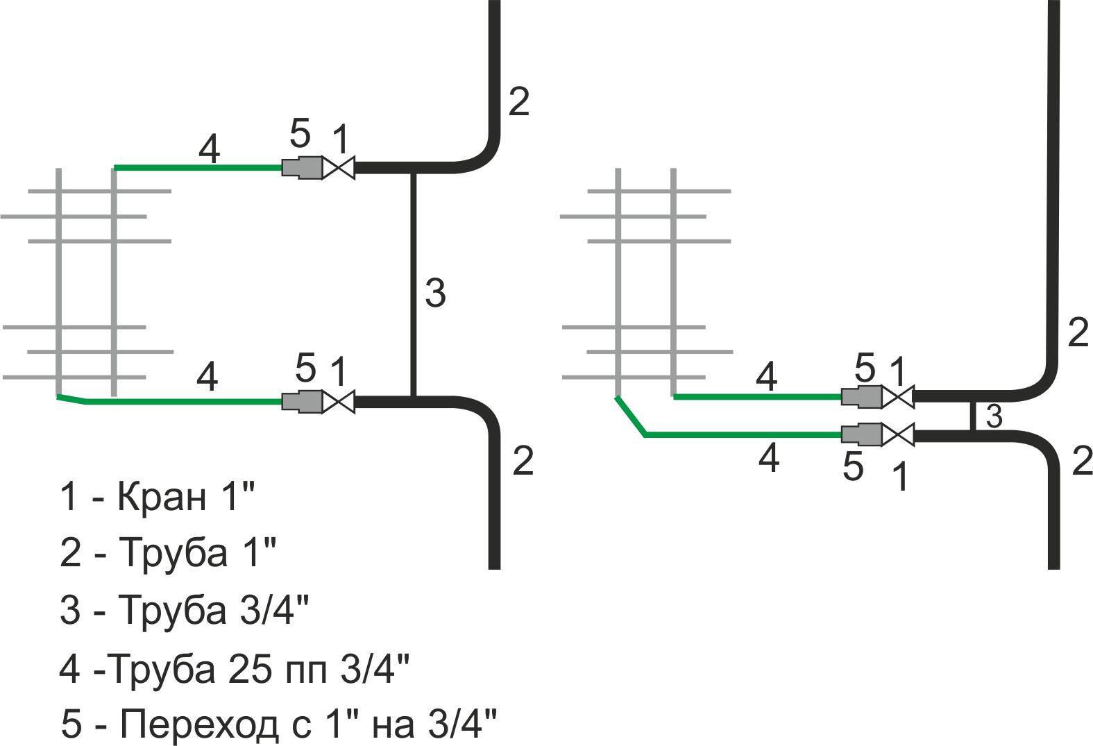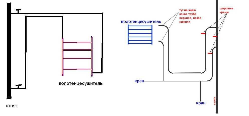 На фото внизу примеры того, как делать не надо. Схемы без крана на байпасе неработоспособны. Чем это грозит — известно. Кроме того, после нескольких лет эксплуатации они вообще перестанут функционировать. Скорее всего это произойдет после очередного отключения — система забьется грязью. Все потому, что весь поток горячей воды пущен через полотенцесушитель. После ремонта в вода несет огромное количество грязи, которая благополучно оседает в изгибах (в самых низких участках в первую очередь). За несколько лет все забивается полностью. По хорошему, все требуется переделать и подключить правильно, ну а помочь горю может только промывка.