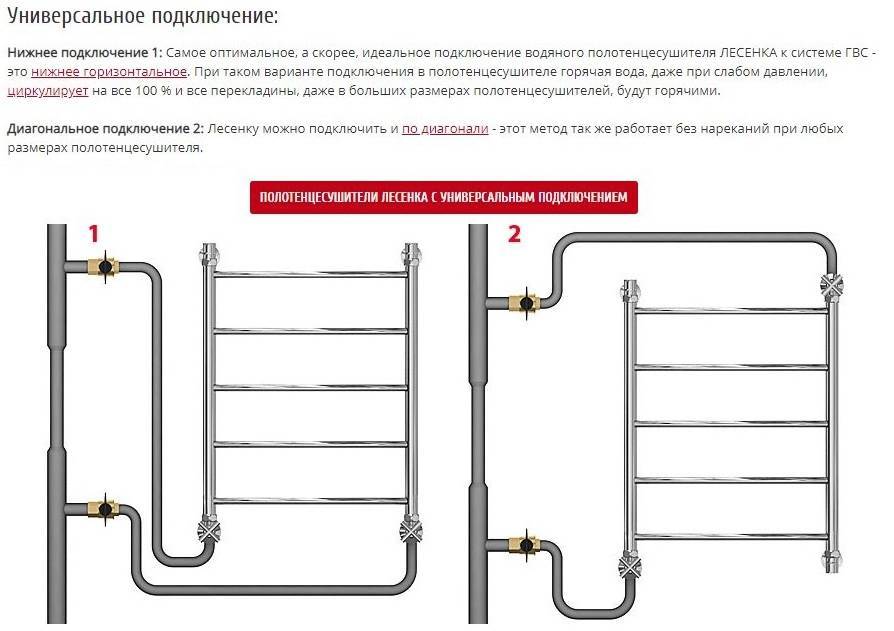 Применение диагонального подсоединения полотенцесушителя считается наиболее эффективным для приборов большой емкости, особенно моделей “лесенка”, так как в рабочем процессе задействованы все проводники тепла.