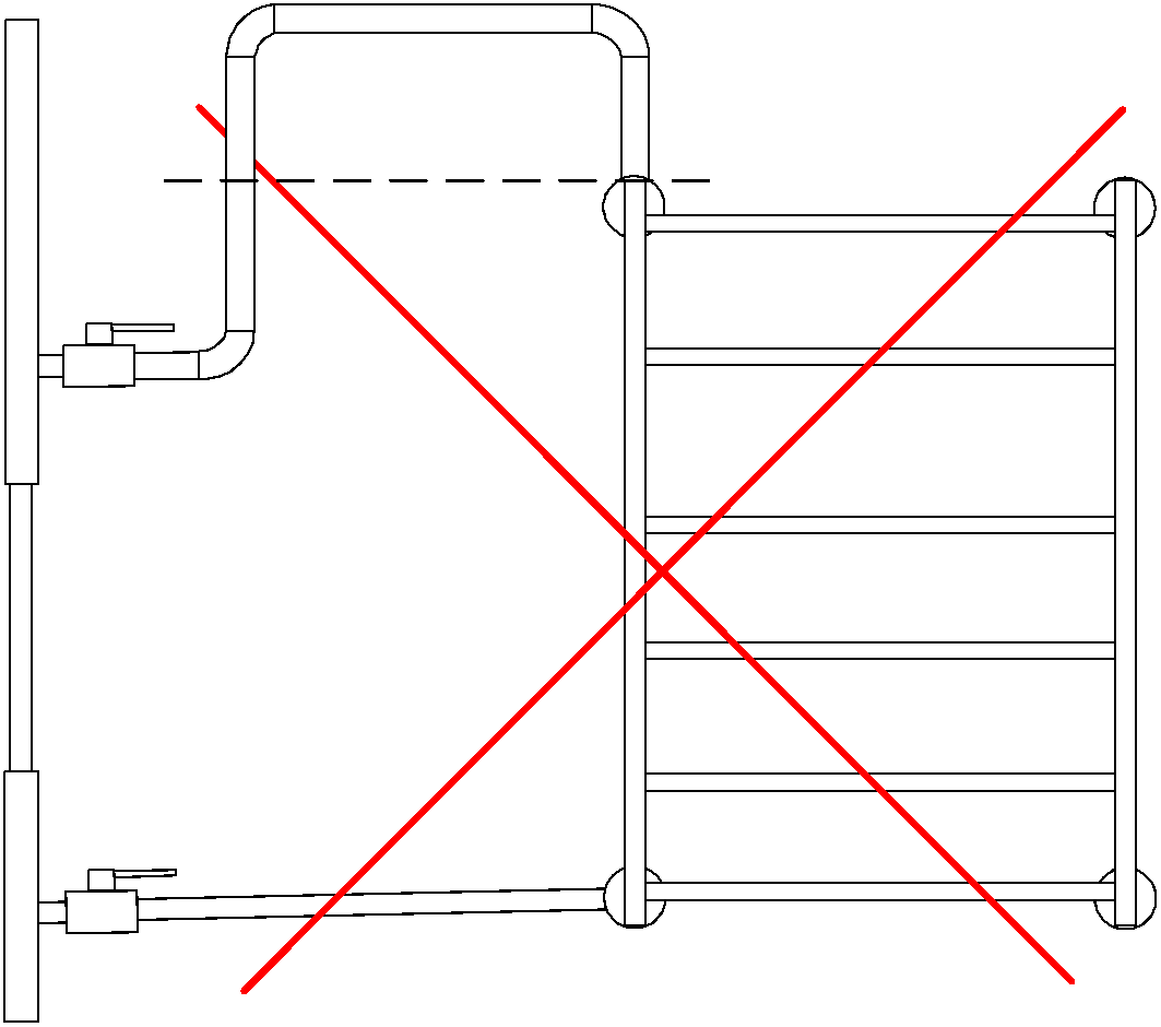 - Верхний отвод стояка расположен выше верхней точки сушителя, нижний — ниже.