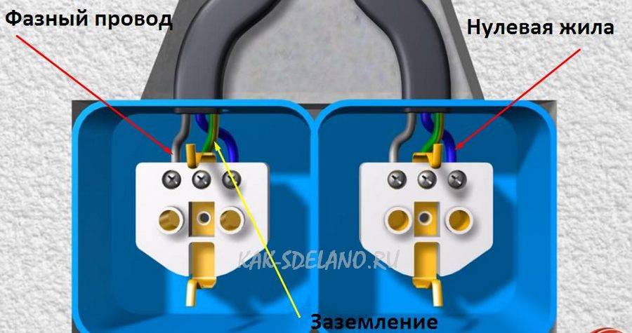В первом случае, подключение полностью идентично подключению одинарной розетки. Это связано с тем, что производитель уже выполнил подключение между розетками, и вам достаточно подключить одну из них, для нормальной работы обеих.