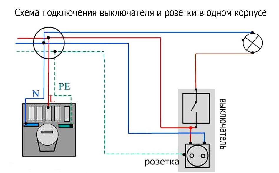 Поэтому схема подключения розетки и коммутатора выполнялась путём соединения проводов в распределительном коробе без совмещения этих устройств. Сейчас такой вариант применим, если по каким-либо причинам нет возможности установки таких потребителей один возле другого. Хотя и раздельное подключение розетки и выключателя имеет свои положительные стороны.