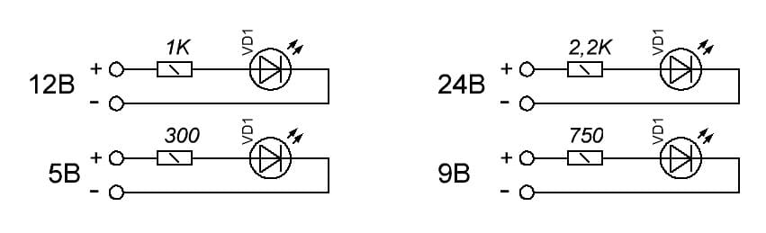 Номинальное напряжение для большинства светодиодов 2,2 — 3 вольта. Светодиодные ленты и модули, которые работают от 12 и более вольт, уже содержат в схеме резисторы.