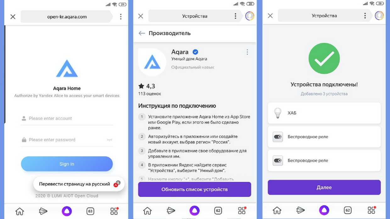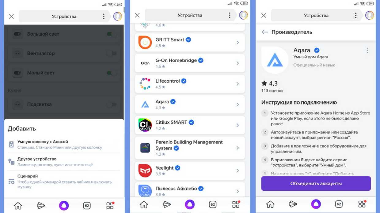 1. Установить приложение Яндекс.Браузер, Яндекс или Маруся.2. Перейти в пункт настроек Мой дом или Умный дом.3. Найти экосистему Aqara и нужное устройство.4. Авторизоваться в предложенной форме той же учетной записью, что используется в Aqara Home.5. Подтвердить подключение, обновить список устройств.