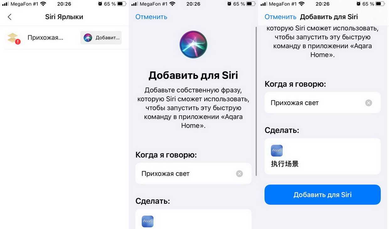 1. Создать в приложении Aqara Home -> Сценарий -> «+» в правом верхнем углу необходимую последовательность действий.2. Активировать переключатель Включить автоматизацию, установив метод запуска.3. Через иконку Siri в настройках созданного сценария создать управляющую фразу.