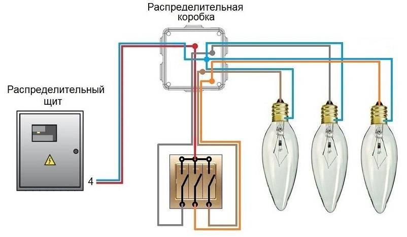 Схема подключения трехклавишного выключателя с помощью распределительной коробки выглядит так