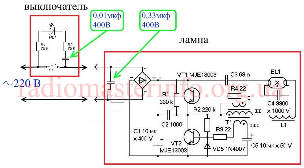 Я остановился на таком варианте. В выключатель поставил конденсатор 0,01 мкф на 630В, а в лампу, параллельно сетевым контактам, конденсатор 0,33мкф на 630В. Доработка показана на схеме и фото ниже: