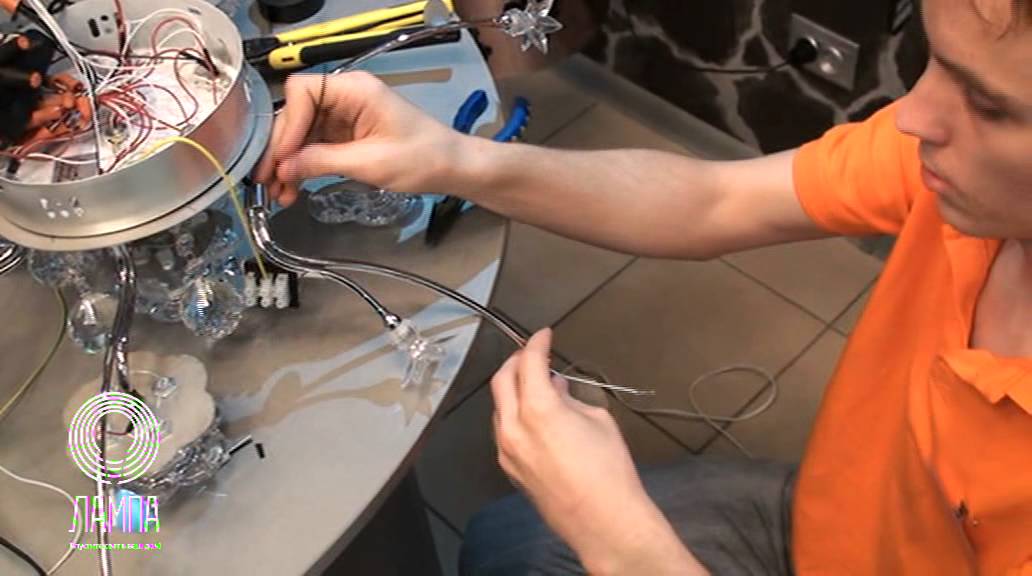 Также проверяется соответствие сечения проводов мощности люстры. Затем происходит сборка люстры и ее установка на потолок.