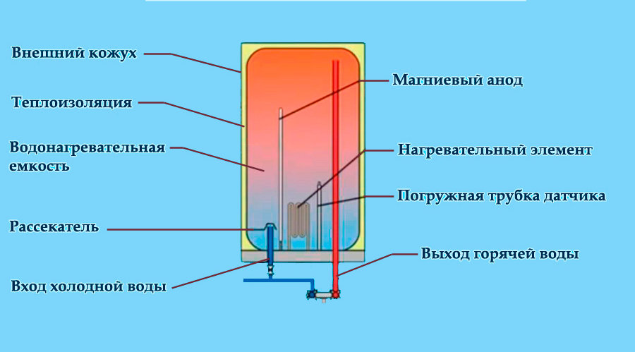 Такая установка представляет собой накопительный бак, внутри которого стоит ТЭН. Вода в баке нагревается до заданной температуры, после чего система работает на поддержание этой температуры. Теплоизоляционный корпус способствует длительному сохранению тепла. В случае необходимости включается ТЭН и немного подогревает воду, доводя ее температуру до заданных значений. Значительное количество энергии тратится только в процессе интенсивного нагрева. Для очистки воды от солей в баке установлен магниевый анод. В некоторых моделях есть защита тэна. В этом случае он работает в сухом режиме, передавая тепло воде через воздушную прослойку.