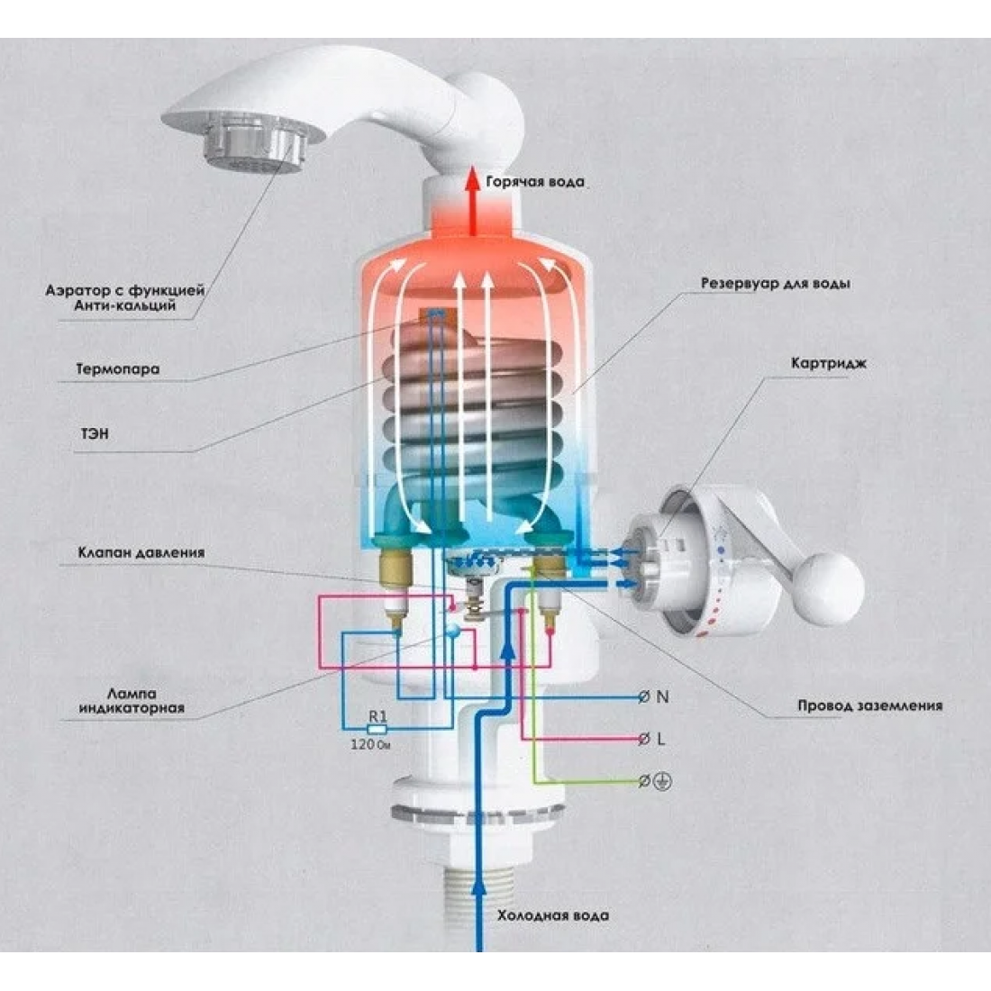 Этот тип бойлера нагревает воду, пока она проходит через него. С одной стороны прибор подключается к водопроводу, с другой, на выходе, к крану или душевой лейке. В документации к прибору подробно описано, как его подключить. Обычно такие устройства имеют несколько режимов.