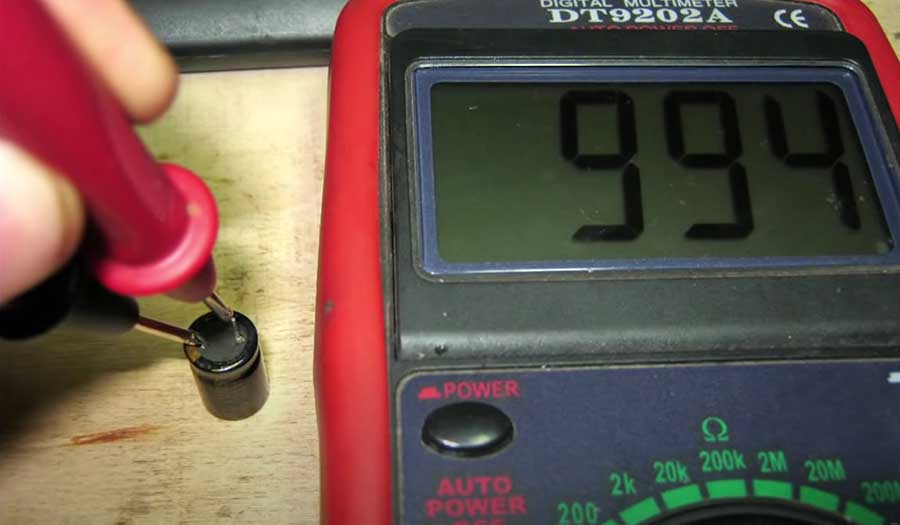 При помощи мультиметра проверяют два параметра конденсатора: внутреннее сопротивление и емкость.