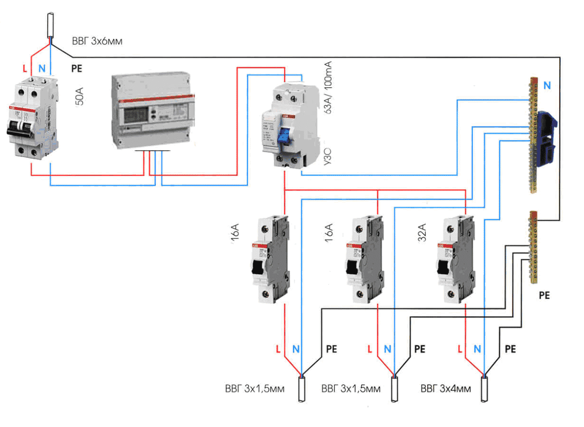 Так как далеко не все потребители могут похвастаться наличием третьего провода в своей проводке, жильцам таких помещений приходиться обходиться тем, что есть. Наиболее простой схемой подключения УЗО является установка защитного элемента после вводного автомата и электрического счетчика. После УЗО актуально подключать автоматические выключатели для различной нагрузки с соответствующим током отключения. Заметьте, что принцип работы УЗО не предусматривает отключение токовых перегрузок и коротких замыканий, поэтому их обязательно устанавливают вместе с автоматическими выключателями.