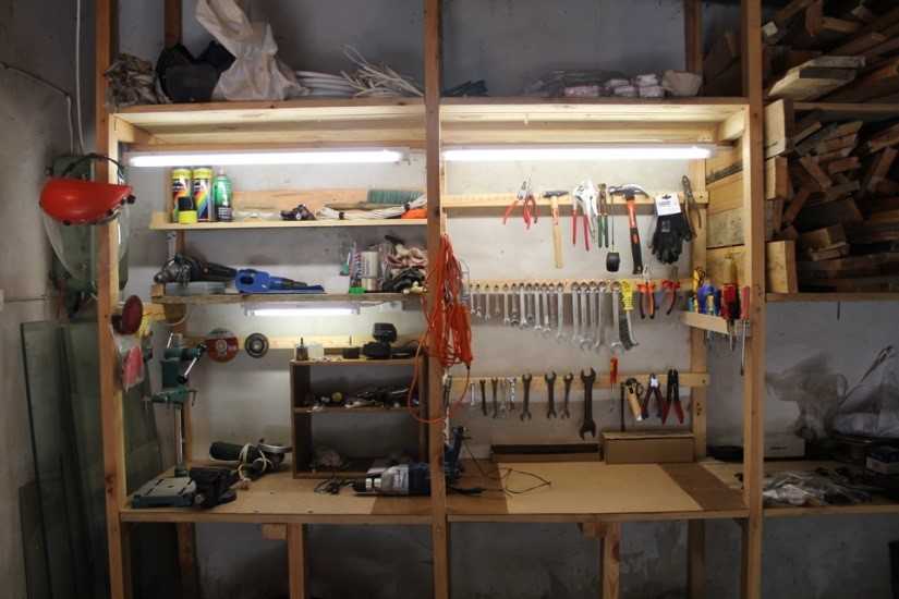 Над рабочим столом установите отдельные светильники со светодиодными или люминесцентными лампами. Выделите для них выключатель (одно- или двухклавишный для разноуровневого освещения). Возле стола, где будет включаться дрель или настольные инструменты (например, машинки для заточки ножей) необходимо поставить несколько розеток. Расположите их как можно ближе к силовой розетке, а еще лучше – проведите для них отдельный кабель. Они должны иметь достаточную мощность для того, чтобы выдержать работу 1–2 электроприборов с большим запасом.
