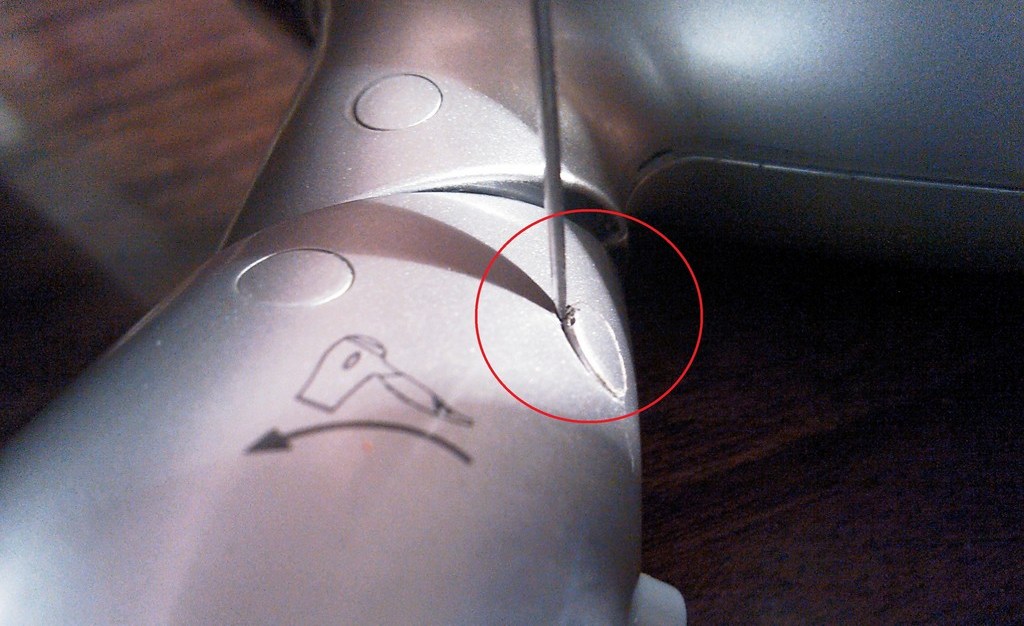 Шаг 2. Если кажется, что со шнуром все в порядке, можно приступить к исследованию внутренностей фена. Чтобы разобрать устройство, нужно открутить винты, которые обычно находятся на обратной или боковой стороне ручки, и снять крышку корпуса. На некоторых моделях эти винты могут находиться не на ручке, а на самом корпусе, около решетки вентилятора или же быть скрыты под декоративными заглушками. Такие заглушки обычно выполнены в цвет корпуса, поэтому заметить их можно не сразу. Чтобы добраться до скрытого винта, нужно подцепить заглушку острым предметом – например, острым кончиком ножа или шилом.