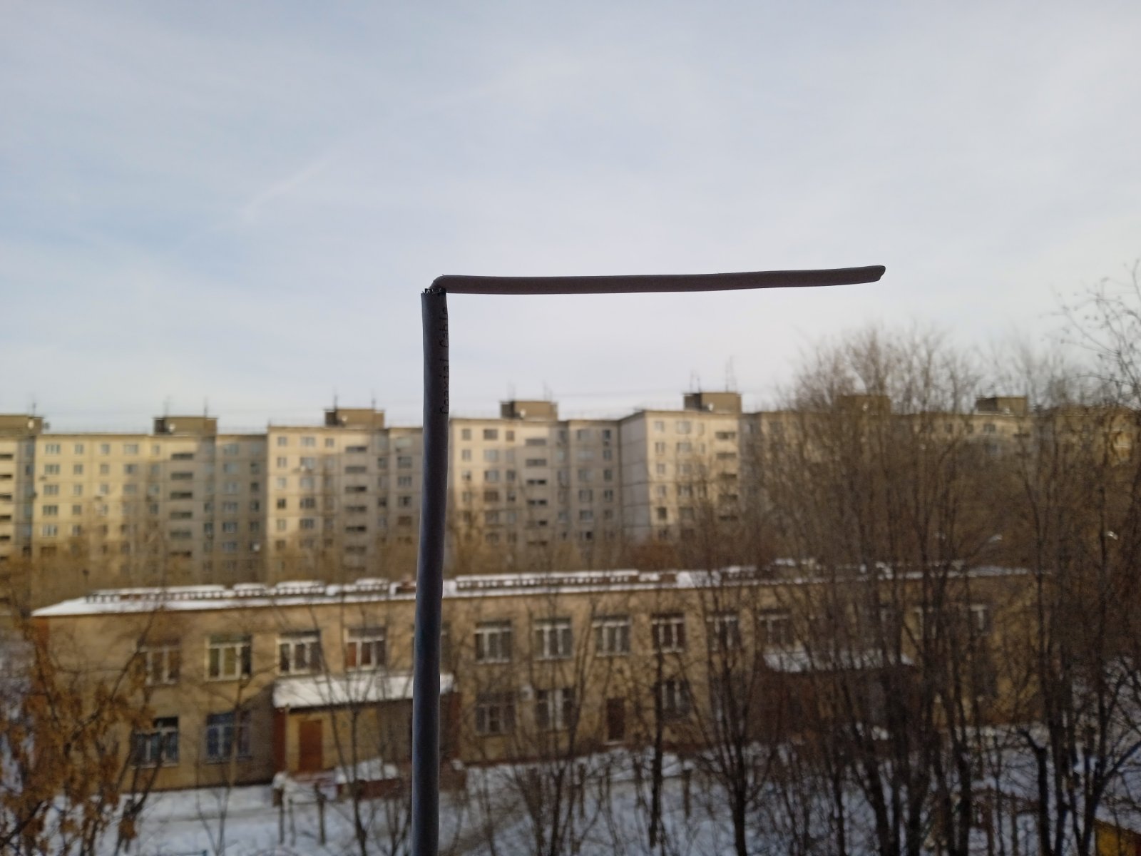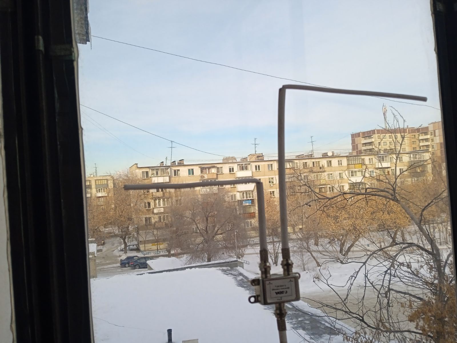 Для наглядности рассмотрения перевернул ее обратной стороной: экраном к передающему центру, а активным вибратором, выполненным из медной шинки — в комнату.