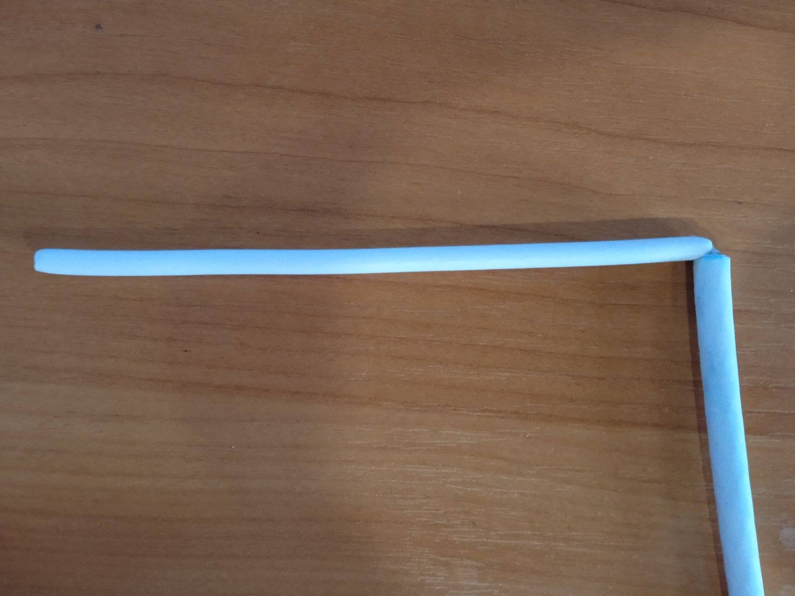 Теперь, старясь не повредить внутренний изолятор снимаем фольгу и металлическую оплётку. Загибаем волновод на 90 градусов (прямой угол).