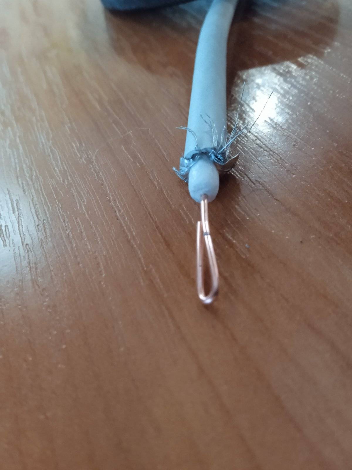 - Соединение частей. Берем антенный кабель, уже тот, который будет использоваться для подключения к телевизору. Длину выбирайте сами. Конец зачищаем, чтобы добраться до медного кабеля, дальше кусочек подчищаем, чтобы осталась фольга. С помощью медной проволоки делаем отводок от фольги (закрепляем кабель вокруг нее). Подключаем основную жилу к одной стороне восьмерки, а отводок – к другой стороне через проволоку.