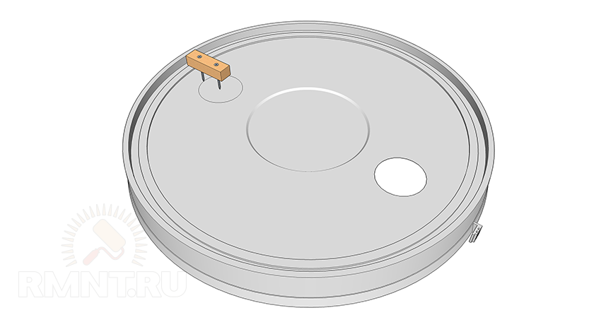 - На верхней крышке прикрепляется брусок, в котором высверливают отверстие. Его диаметр равен диаметру подключаемого шланга.